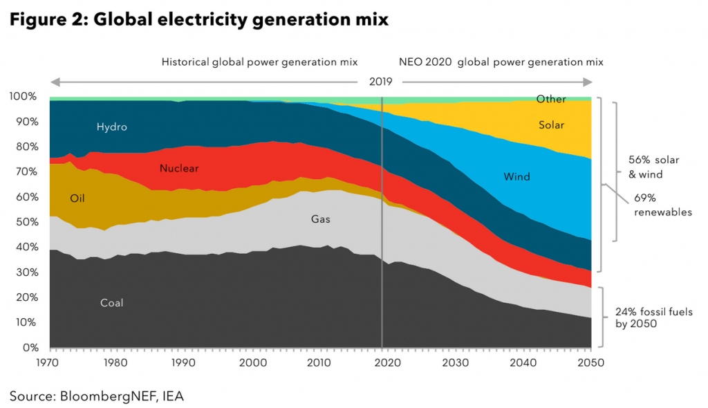 Particulièrement intéressant, en page 8, la progression des énergies. On voit le pétrole tout bonnement disparaître dans la production d’électricité et l’explosion de l’éolien et du photovoltaïque. Néanmoins, c’est la projection d’investisseurs, il faudra aller beaucoup plus vite, ce schéma sera certainement appelé à évoluer très vite. Quand on voit que Total imagine faire « plus que » 20% de son chiffre d’affaires avec le pétrole en 2050, en réalité il y a fort à parier qu’ils n’en produiront plus du tout. Il y a une résistance de la part des investisseurs qui même lorsqu’ils ont compris où se trouvaient leurs intérêts font preuve de nostalgie.